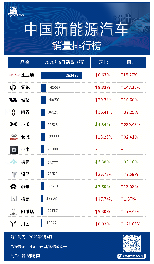 據(jù)Mysteel不完全統(tǒng)計(jì),截至2025年6月4日,13家主流車(chē)企發(fā)布2025年5月新能源汽車(chē)銷(xiāo)量數(shù)據(jù),11家車(chē)企實(shí)現(xiàn)同比正增長(zhǎng)。