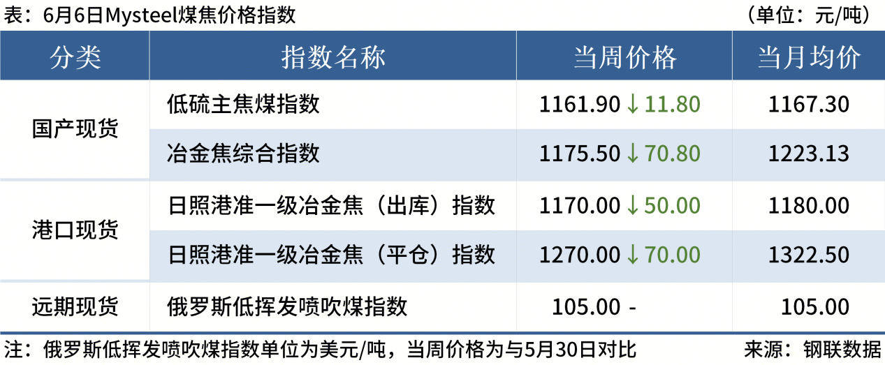 ◎ 2025年5月至6月初,蒙古進(jìn)口煉焦煤市場(chǎng)價(jià)格呈現(xiàn)持續(xù)下行趨勢(shì),甘其毛都口岸蒙5#原煤價(jià)格從5月7日的830元/噸降至6月6日的705元/噸,累計(jì)跌幅達(dá)15.06%。詳情>>