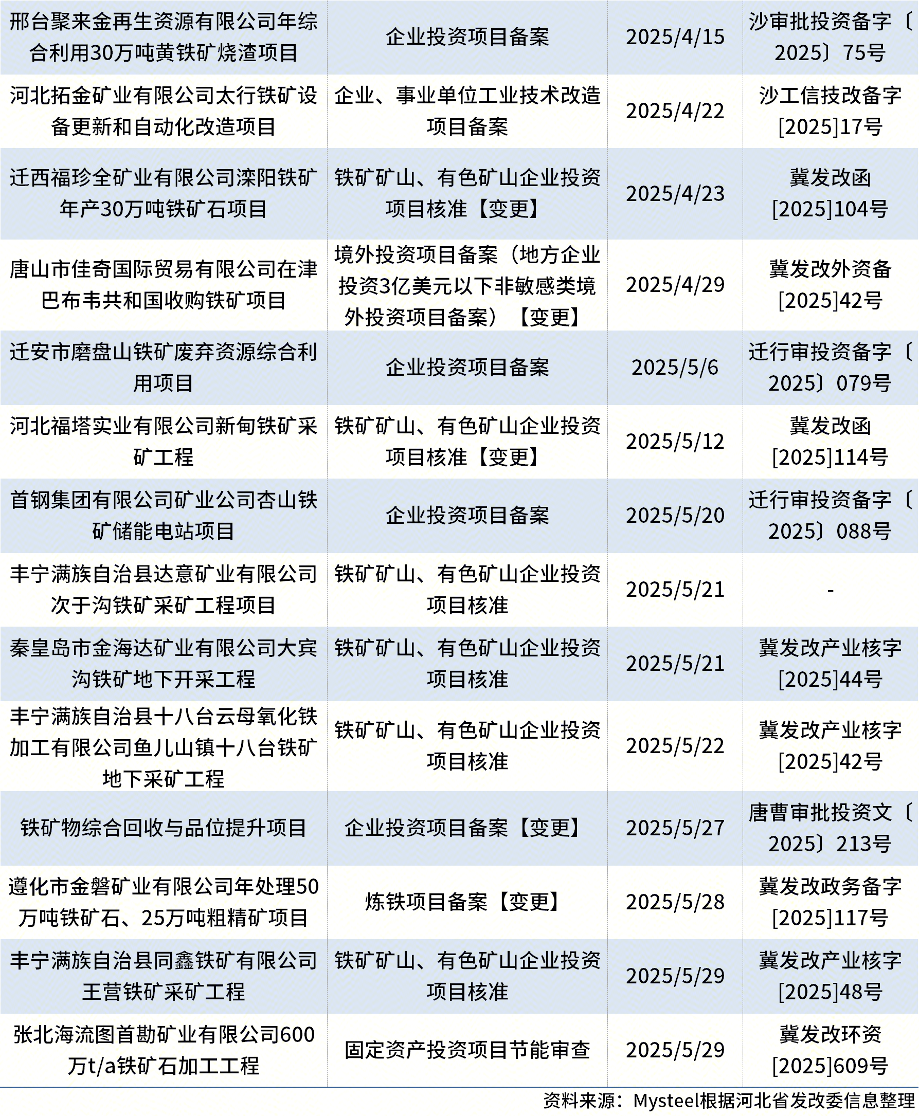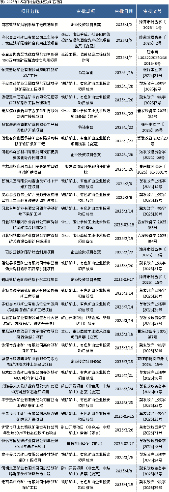 據(jù)Mysteel不完全統(tǒng)計(jì),2025年1-5月河北省共批復(fù)鐵礦石相關(guān)項(xiàng)目48個(gè),分別是21個(gè)鐵礦礦山、有色礦山企業(yè)投資項(xiàng)目核準(zhǔn)或【變更】、9個(gè)企業(yè)投資項(xiàng)目備案或【變更】、2個(gè)節(jié)能審查、4個(gè)礦山開發(fā)項(xiàng)目(非金屬、非煤礦山)備案或【變更】、2個(gè)煉鐵項(xiàng)目備案【變更】、5個(gè)企業(yè)、事業(yè)單位工業(yè)技術(shù)改造項(xiàng)目備案或【變更】、1個(gè)境外投資項(xiàng)目備案(地方企業(yè)投資3億美元以下非敏感類境外投資項(xiàng)目備案)【變更】、1個(gè)建設(shè)工程、臨時(shí)建設(shè)工程規(guī)劃許可、1個(gè)企業(yè)投資項(xiàng)目備案、1個(gè)一般建設(shè)項(xiàng)目環(huán)境影響評(píng)價(jià)審批和1個(gè)固定資產(chǎn)投資項(xiàng)目節(jié)能審查。