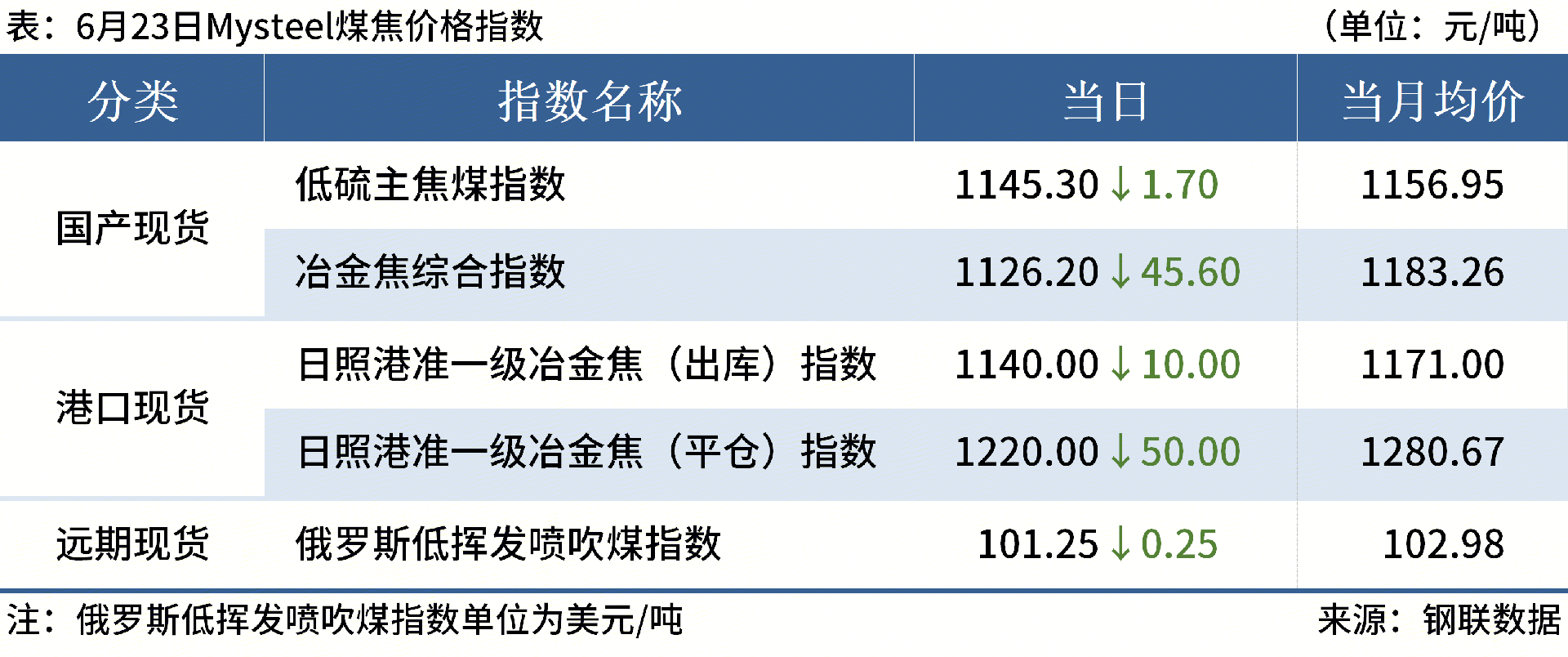 ◎ 6月23日,焦炭市場(chǎng)價(jià)格偏弱運(yùn)行,第四輪降價(jià)落地。河北山東主流鋼廠針對(duì)焦炭采購(gòu)價(jià)格下調(diào)濕熄50元/噸,干熄55元/噸。