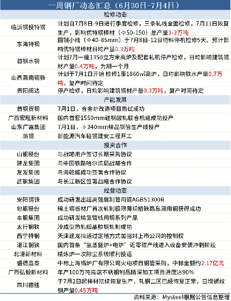 據(jù)Mysteel不完全統(tǒng)計(jì),本周(6月30日-7月4日)5家鋼廠發(fā)布檢修信息,具體如下: