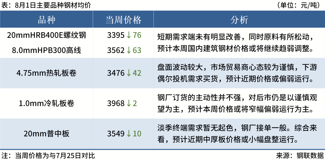 ◎ Mysteel首席分析師汪建華:8月鋼鐵市場,產(chǎn)業(yè)人士的信心不足,仍對鋼材價格構(gòu)成拖累,而供需或呈現(xiàn)雙弱的態(tài)勢,鋼材價格仍有階段性進(jìn)一步回調(diào)的壓力。但若鋼廠增強(qiáng)自律性控產(chǎn),疊加行政性指引,鋼價才有震蕩反彈的空間。詳情>>