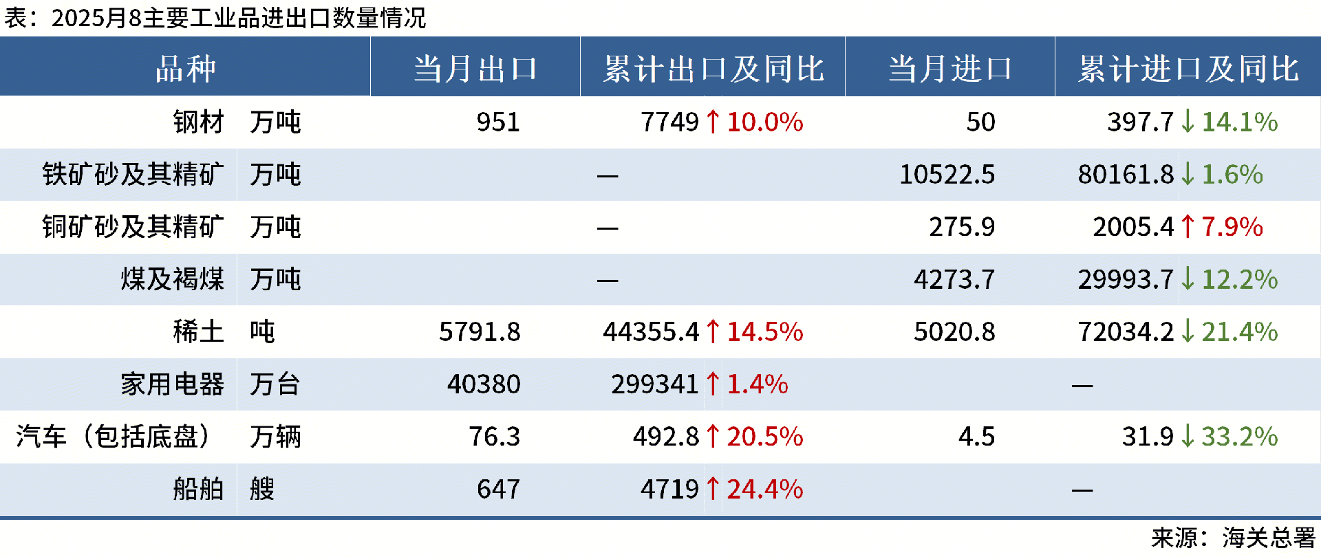 ◎海關(guān)總署數(shù)據(jù)顯示,8月中國出口鋼材951.0萬噸,較上月減少32.6萬噸,環(huán)比下降3.3%;1-8月累計(jì)出口鋼材7749.0萬噸,同比增長10%。其他主要工業(yè)品進(jìn)出口情況如下: