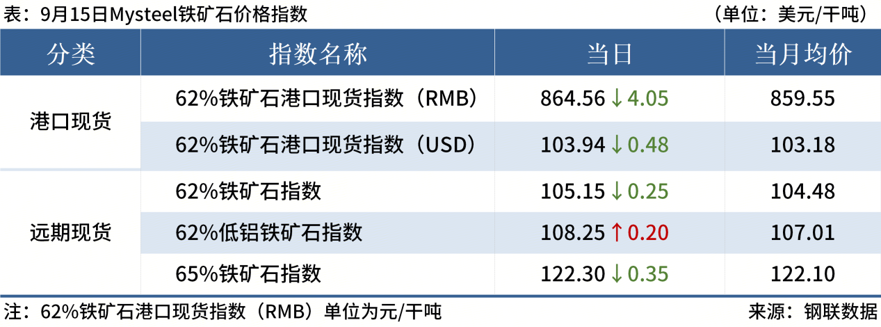 ◎ 9月15日,全國主港鐵礦石成交96.00萬噸,環(huán)比減13.9%;237家主流貿(mào)易商建筑鋼材成交11.76萬噸,環(huán)比增1%。