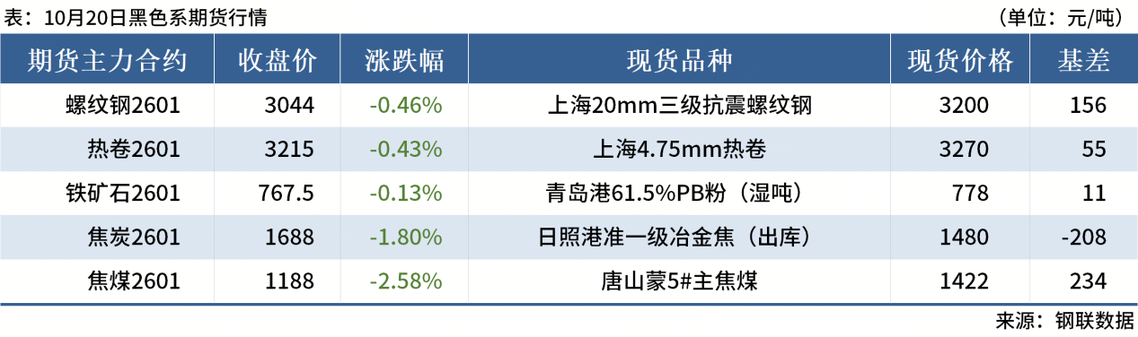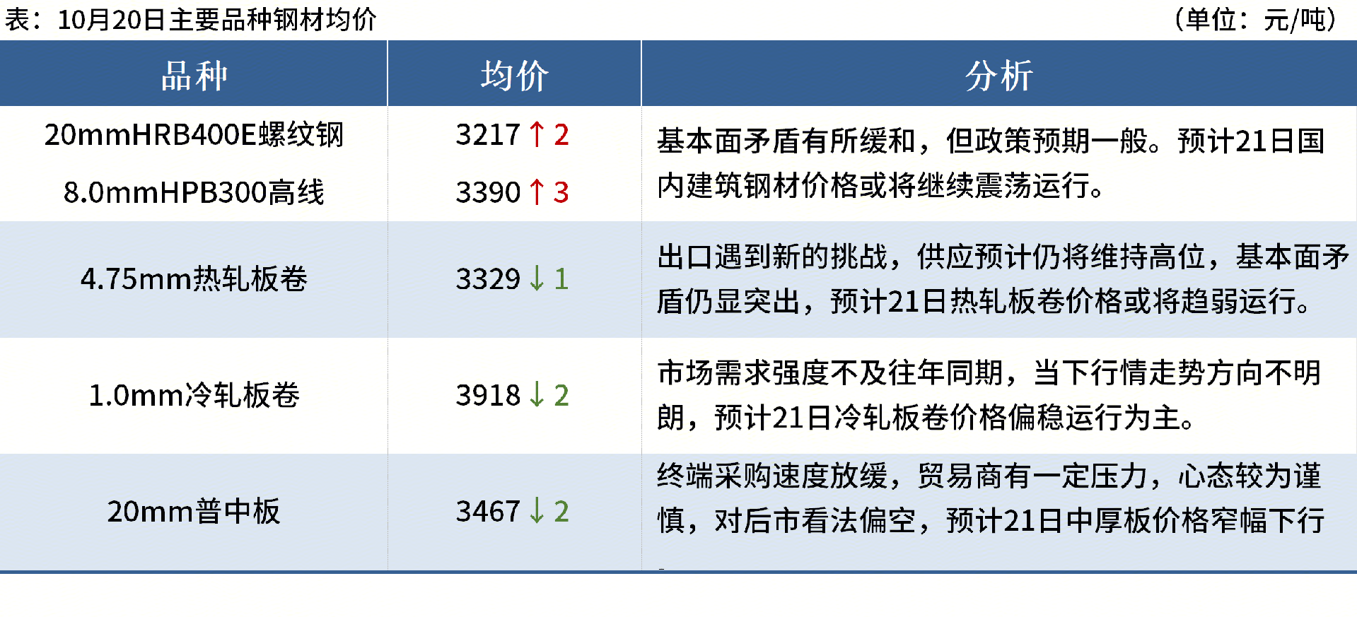 ◎10月20日,中天鋼鐵出臺(tái)10月下旬價(jià)格,螺紋下調(diào)50元/噸,線(xiàn)材盤(pán)螺下調(diào)50元/噸?,F(xiàn)華東螺紋3350元/噸,線(xiàn)材盤(pán)螺3550元/噸。