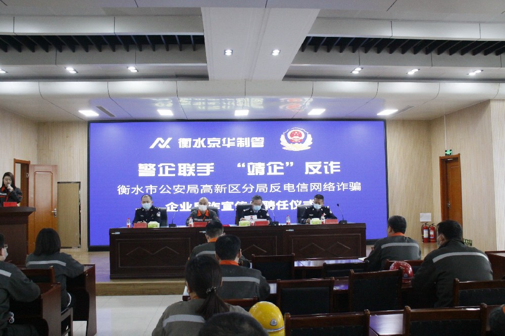 警企聯(lián)手 “靖企”反詐— 衡水京華召開企業(yè)反詐宣傳員聘任儀式4月28日,衡水市公安局高新區(qū)分局黨委委員、副局長張驥等一行4人蒞臨公司宣傳反詐知識,在公司辦公樓五樓召開了以“警企聯(lián)手,‘靖企’反詐”為主題的企業(yè)反詐宣傳員聘任儀式。公司常務(wù)副總趙志強(qiáng),生產(chǎn)副總劉國勇,總經(jīng)理助理馬亮同公司員工代表參與會議。會議上衡水市公安局···